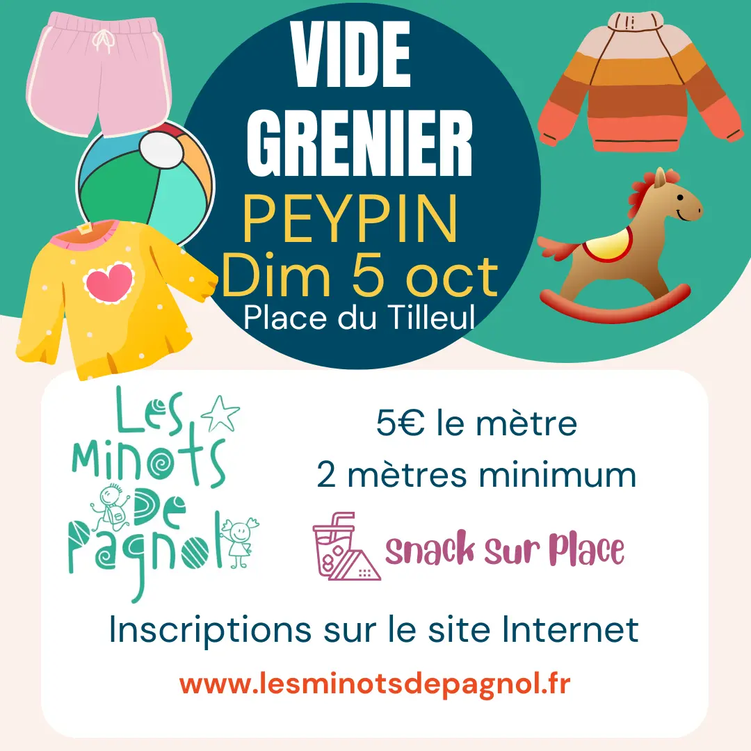 L’association Les Minots de Pagnol a le plaisir d’annoncer son grand vide-grenier, qui aura lieu le dimanche 5 octobre 2025, sur la Place du Tilleul à Peypin.